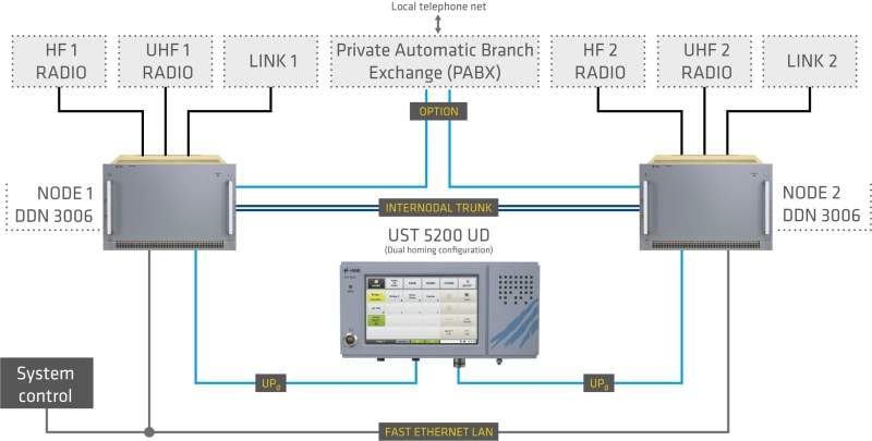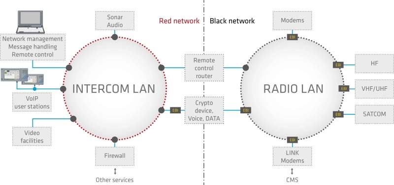 - Flexible and decentralised system architecture with a radio network for access to radio facilities, intercom LAN with interfaces to other ship subsystems, network management system for configuration, monitoring and contron, as well as utilisation of existing IP backbone systems