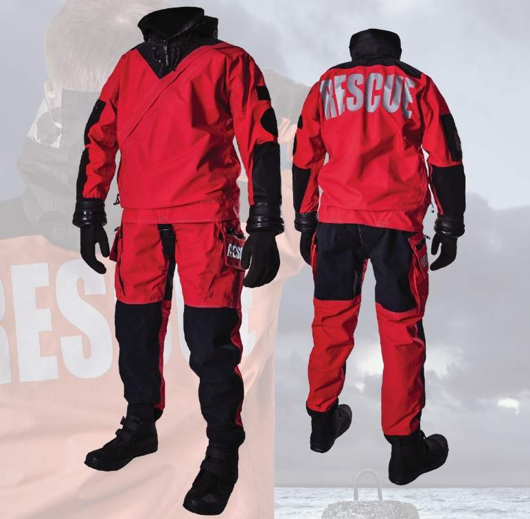 SANTI’s Immersion and Rescue Suits are made of four layers of breathable fabric with a density of 202g/m²-278g/m². They have a built-in hood, reinforced pads, small wrist dump valves, and a relief zipper.