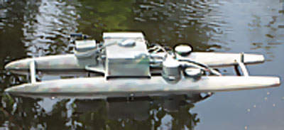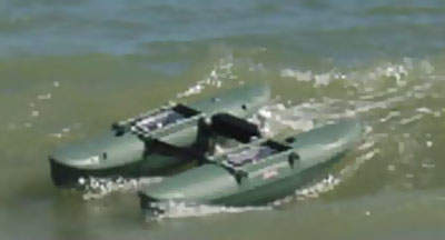 Our USV-5000 self-righting mono-hull USV has a maximum speed of 3.5m/s, a weight of 100kg, LOA of 4m, and a 50kg instrument capacity, enabling its use for multi-beam surveys. This vessel is very efficient and capable of heavier sea and surf zone operations due to self-righting features. The mono-hull is stable because of its deep keel and length.