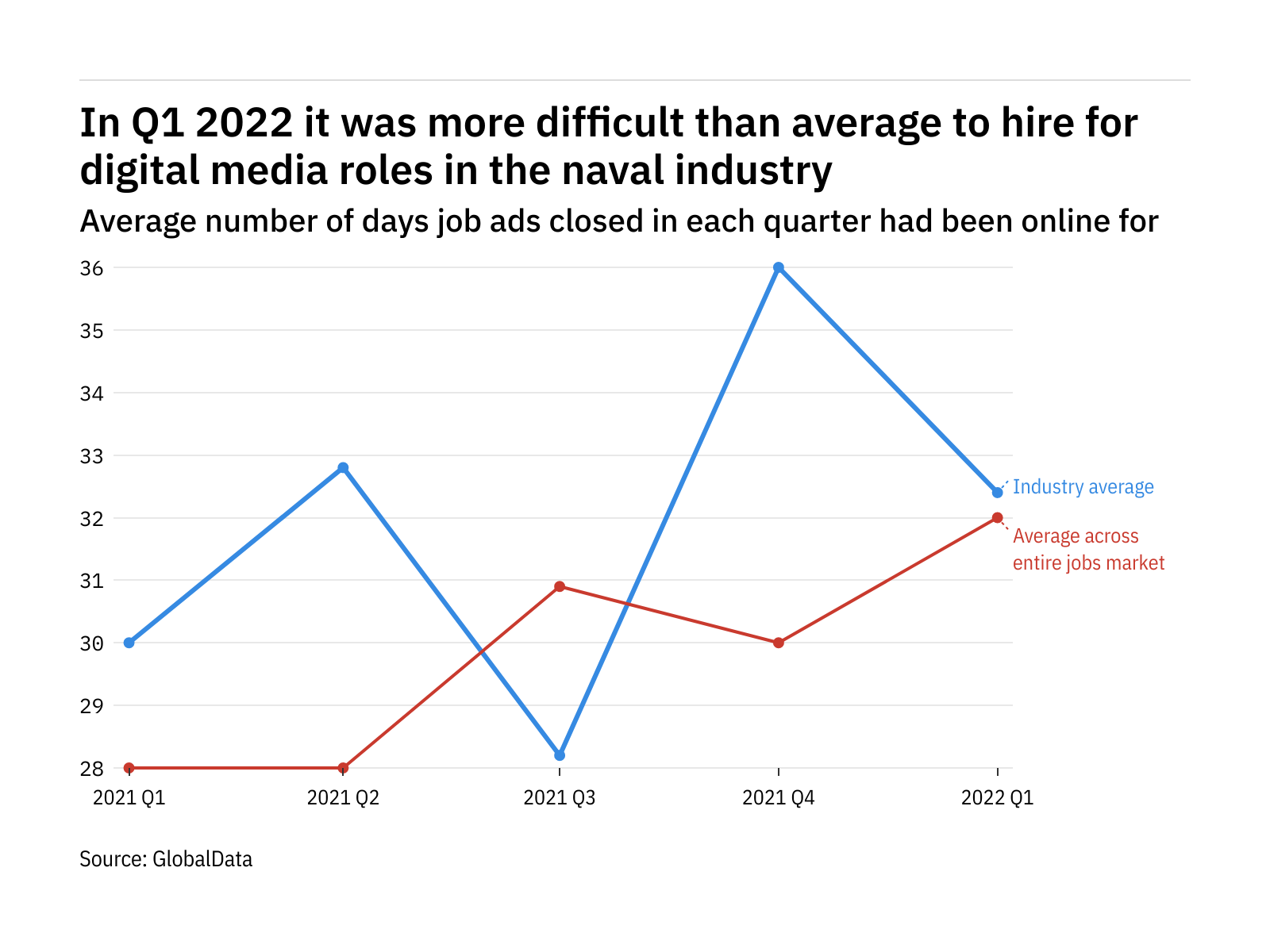 While the naval industry found it harder to fill these roles in the latest quarter, these companies also found it harder to recruit digital media jobs than the wider market, with ads online for 1.2% more time on average compared to similar jobs across the entire jobs market.