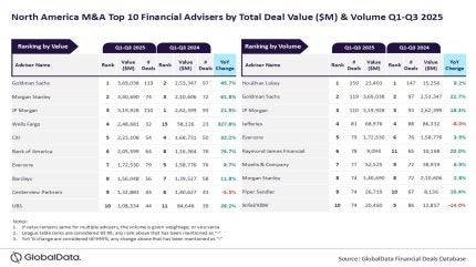 Goldman Sachs and Houlihan Lokey have emerged as the leading mergers and acquisitions (M&A) financial advisers in North America by value and volume, respectively, for the first three quarters of 2025.