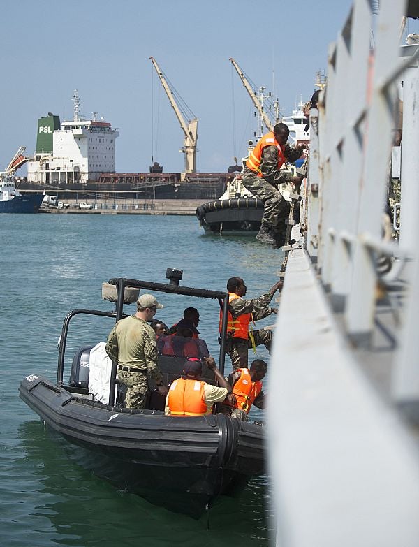 Image: Djiboutian Marines conducting ship-boarding operation as part of Exercise Cutlass Express 2013 at the port of Djibouti. Photo: courtesy of Sgt. Chad Warren.