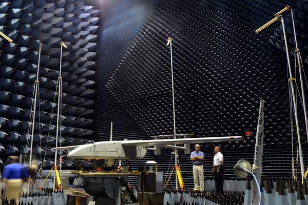During the testing, the communications and GPS navigation programme office (PMW/A 170) had placed an Aerostar unmanned aerial vehicle (UAV), fitted with small antenna system (SAS), in a room lined with signal-absorbent material at the facilities for antenna and RCS measurements (FARM) and was subjected to GPS jamming signals.