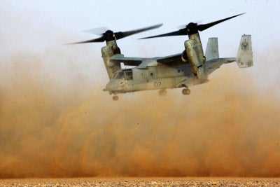 Image: Bell Boeing-built V-22 aircraft readies to land in adverse conditions. Photo: US Marine Corps photo.