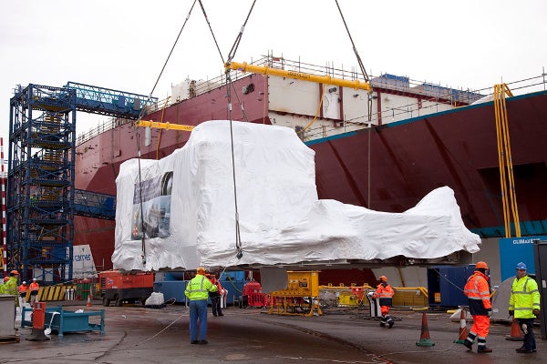 Image: Rolls-Royce’s MT30 enclosure alongside HMS Queen Elizabeth, prior to installation. Photo: courtesy of Rolls-Royce plc 2013.