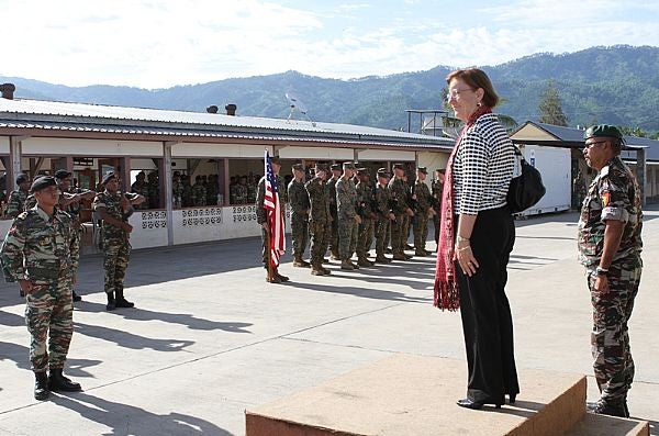 Image: US Ambassador Judith Fergin addresses US and Timorese navies’ personnel. Photo: US Navy photo by Prudencio Cabral/Released.