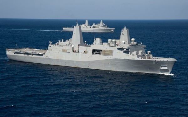 Image: Arlington (LPD 24) in formation with Anchorage (LPD 23) following completion of acceptance trials. Photo: courtesy of Huntington Ingalls Industries.