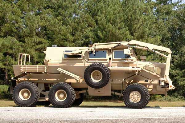 The six-wheel heavily armoured explosive ordnance disposal (EOD) vehicle is integrated with a 30ft robotic arm and iron claw to support ordinance disposal and route-clearance missions.