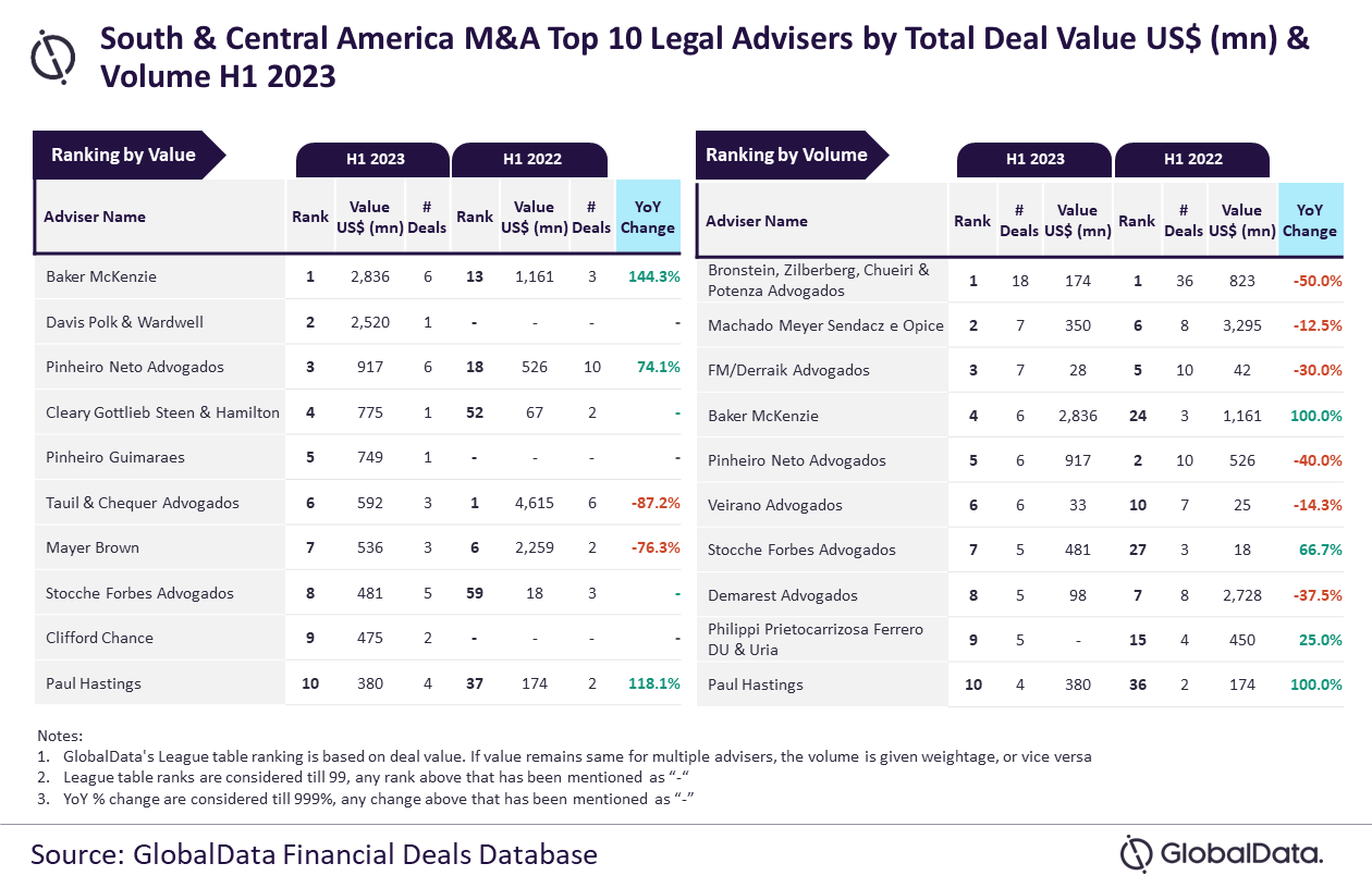 Baker McKenzie and Bronstein, Zilberberg, Chueiri & Potenza Advogados were the top mergers and acquisitions (M&A) legal advisers in South & Central America region in H1 2023, according to GlobalData’s latest league table.