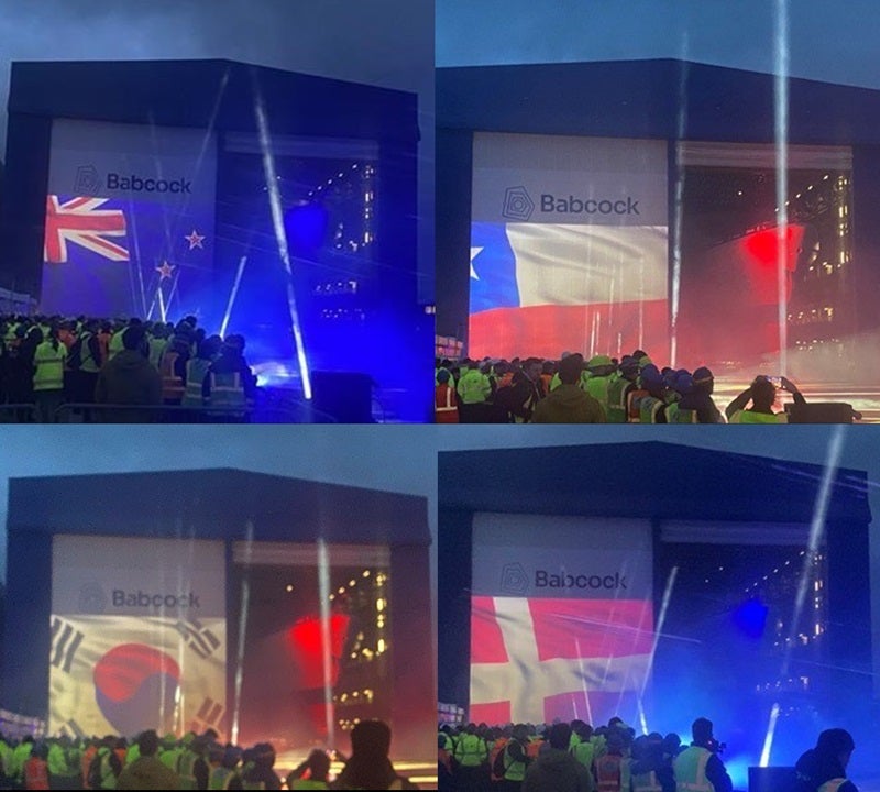 But while HMS Active was rolling out of the Venturer Building atop a moving platform with 960 tyres, several international flags were projected alongside the emerging vessel. Beyond existing customers, this included Chile, Denmark, New Zealand, South Korea and Sweden.