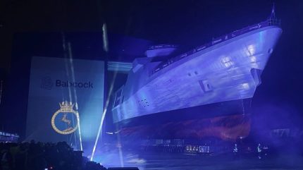 But while HMS Active was rolling out of the Venturer Building atop a moving platform with 960 tyres, several international flags were projected alongside the emerging vessel. Beyond existing customers, this included Chile, Denmark, New Zealand, South Korea and Sweden.