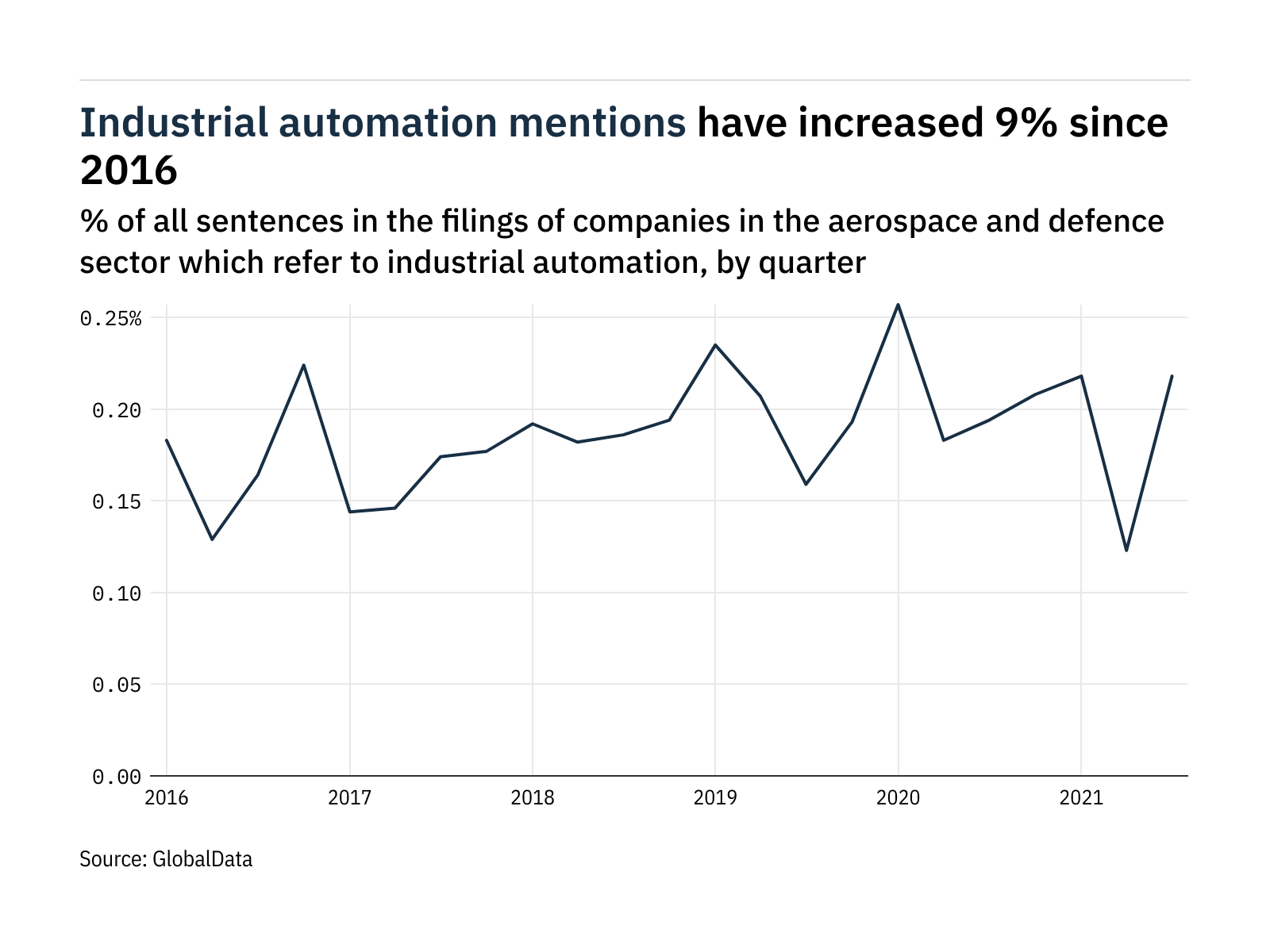 When companies in the aerospace and defence sector publish annual and quarterly reports, ESG reports and other filings, GlobalData analyses the text and identifies individual sentences that relate to disruptive forces facing companies in the coming years. Industrial automation is one of these topics - companies that excel and invest in these areas are thought to be better prepared for the future business landscape and better equipped to survive unforeseen challenges.